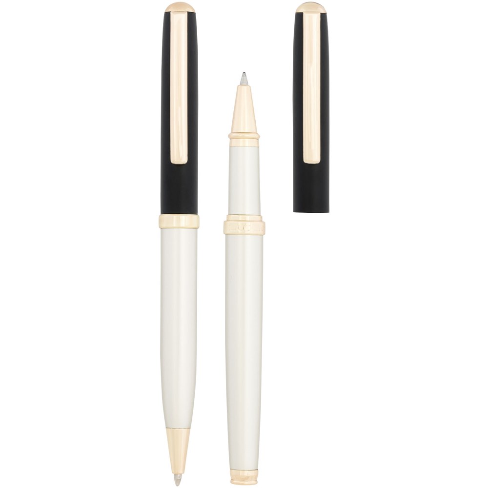 Ein modernes Schreibset bestehend aus einem Drehkugelschreiber und einem Kappentintenroller, das... mehr