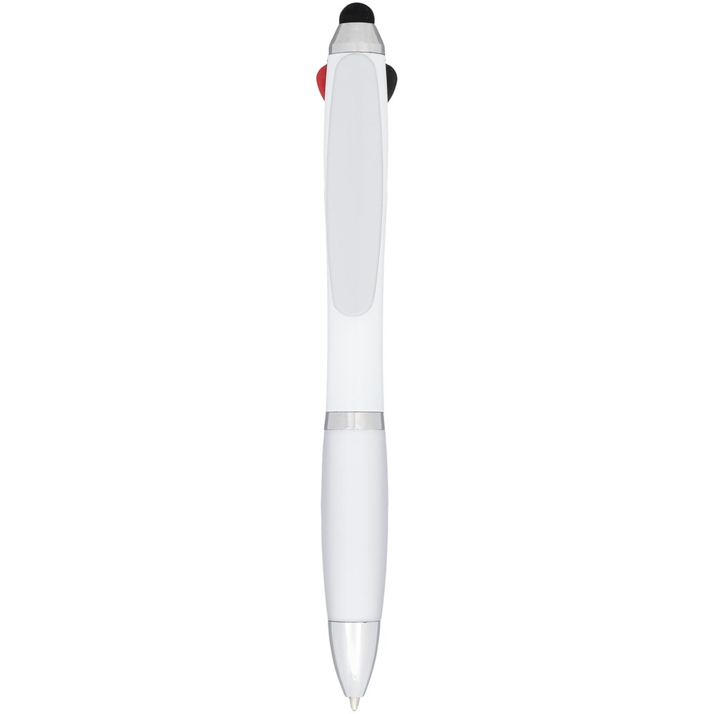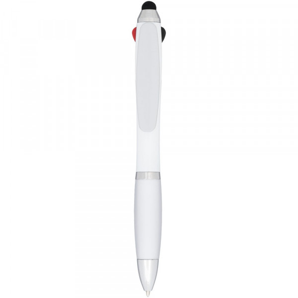 Nash Kugelschreiber mit weißem Schaft und farbigem Griff und Clip. Vier Funktionen in einem wertigen Stift: rote, schwarze und blaue Mine plus eine Stylus-Spitze. Kugelschreiber mit Klickmechanismus und Softtouch-Griff.