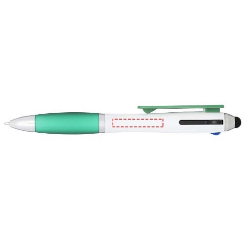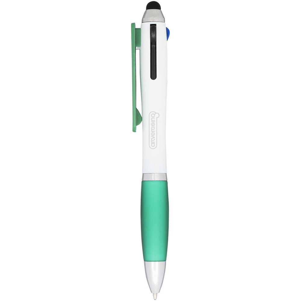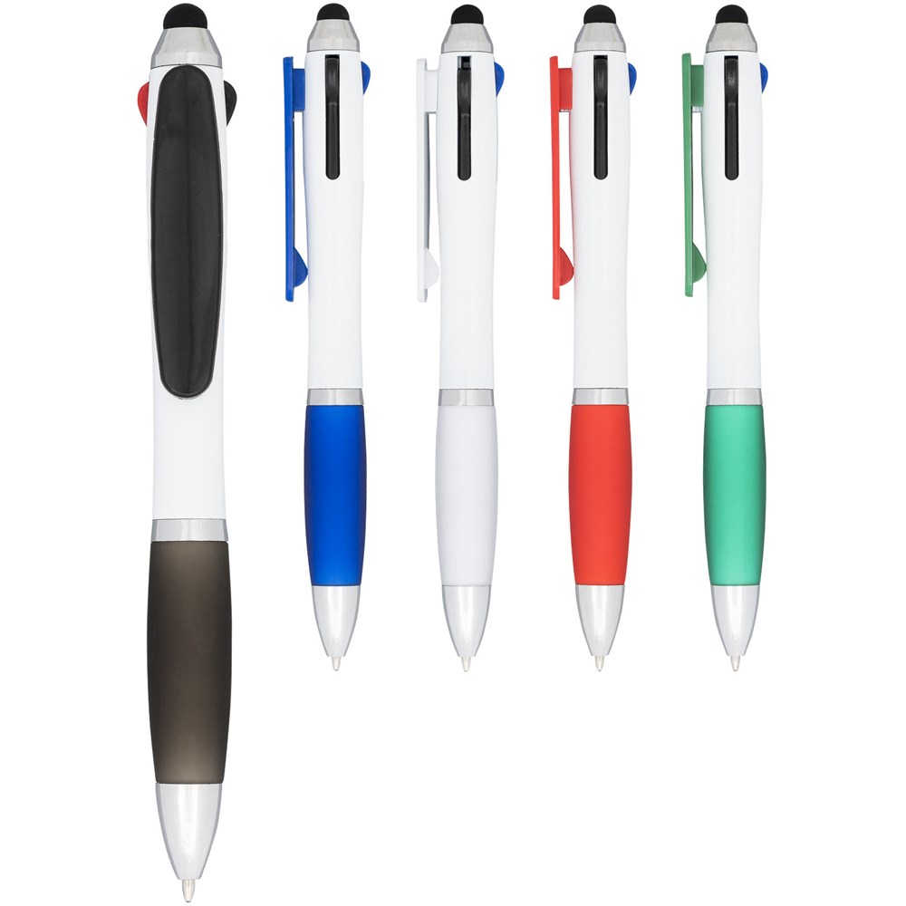 Nash Kugelschreiber mit weißem Schaft und farbigem Griff und Clip. Vier Funktionen in einem wertigen Stift: rote, schwarze und blaue Mine plus eine Stylus-Spitze. Kugelschreiber mit Klickmechanismus und Softtouch-Griff.