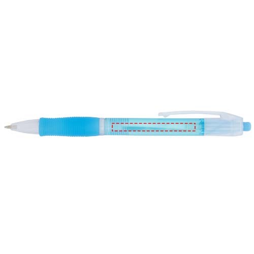 Farbiger Kugelschreiber mit Klickmechanismus mit transparentem Schaft und gummiertem Griff in passender Farbe.
