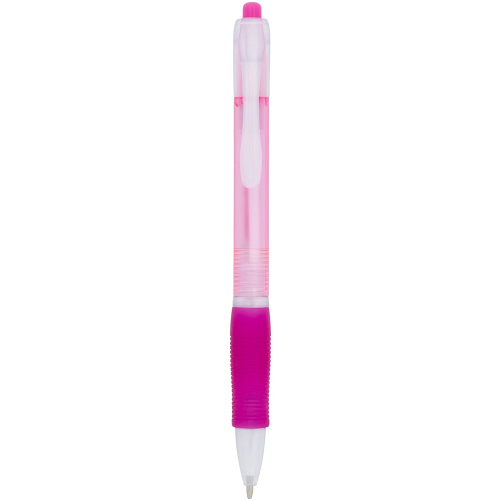 Farbiger Kugelschreiber mit Klickmechanismus mit transparentem Schaft und gummiertem Griff in passender Farbe.