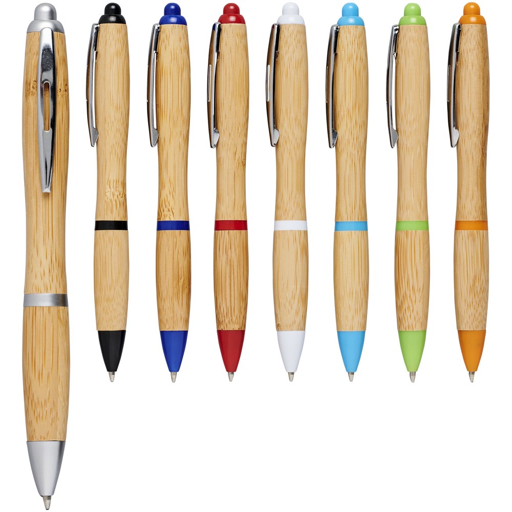 Kugelschreiber mit Klickmechanismus, mit einem Schaft aus Bambus, akzentuiert durch einen verchromten Clip und Verzierungen aus ABS-Kunststoff. Die Farbe des Bambusmaterials kann variieren.