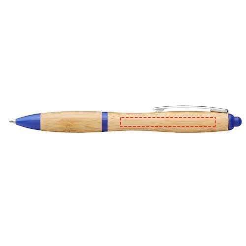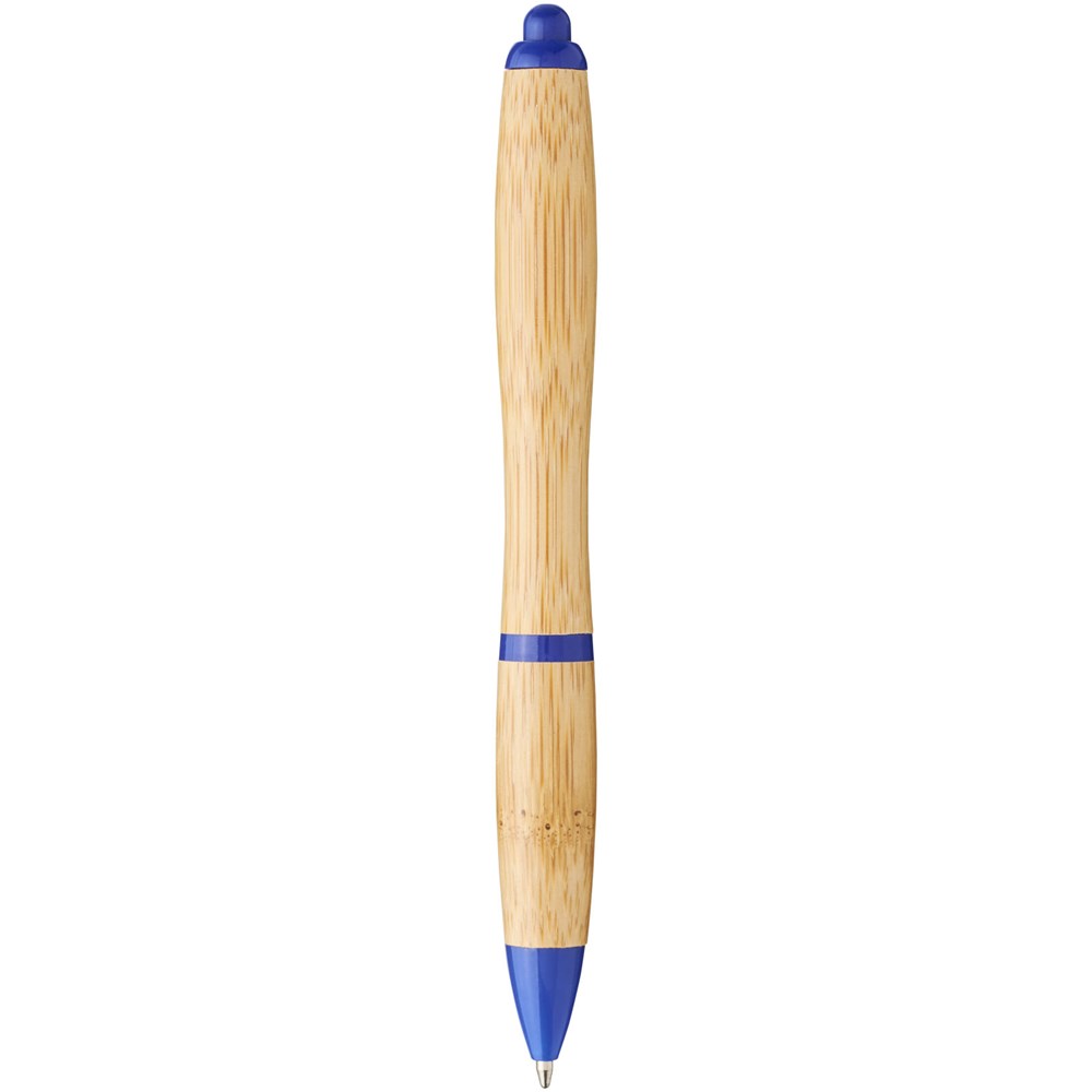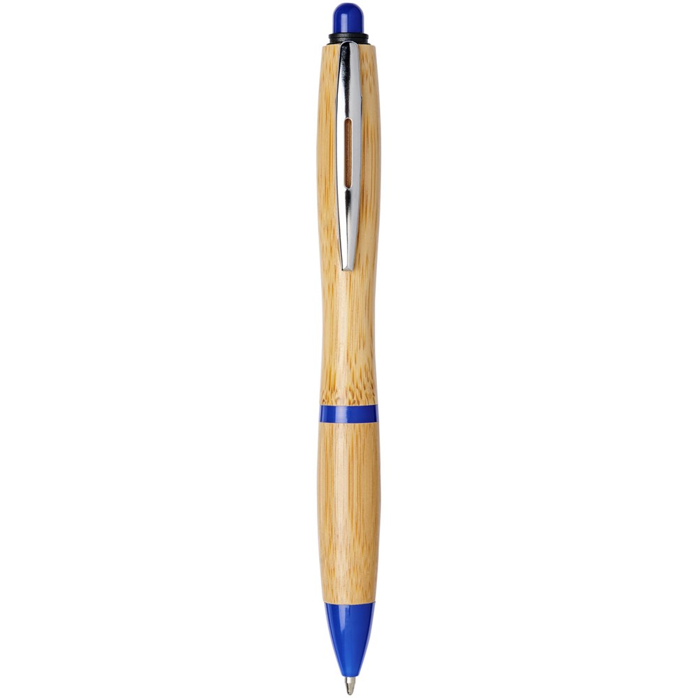 Kugelschreiber mit Klickmechanismus, mit einem Schaft aus Bambus, akzentuiert durch einen verchromten Clip und Verzierungen aus ABS-Kunststoff. Die Farbe des Bambusmaterials kann variieren.