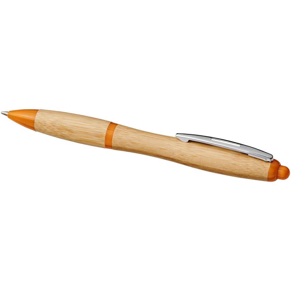 Kugelschreiber mit Klickmechanismus, mit einem Schaft aus Bambus, akzentuiert durch einen verchromten Clip und Verzierungen aus ABS-Kunststoff. Die Farbe des Bambusmaterials kann variieren.