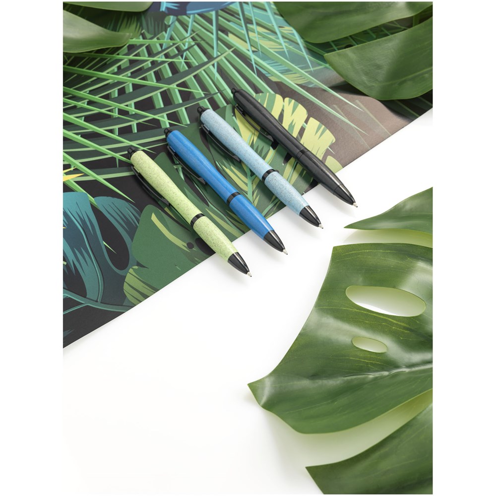 Kugelschreiber mit Klickmechanismus, mit Schaft aus Weizenstroh und einfarbigen schwarzen Details. Bei Weizenstroh handelt es sich um zurückgebliebene Stiele nach der Ernte von Weizenkörnern, was die Menge an Kunststoff reduziert.