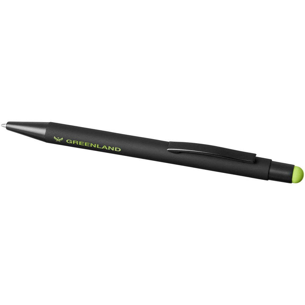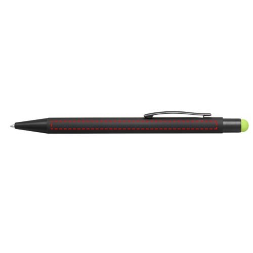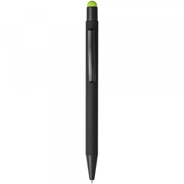 Gummierter Stylus-Kugelschreiber mit Klickmechanismus. Die Farbe der Stylusspitze entspricht der lasergravierten Unterschicht des Stiftes. Der Stift hat einen Metallclip und einen Gummi-Eingabestift und ist aus Aluminium gefertigt. Schreiblänge: 450 m.