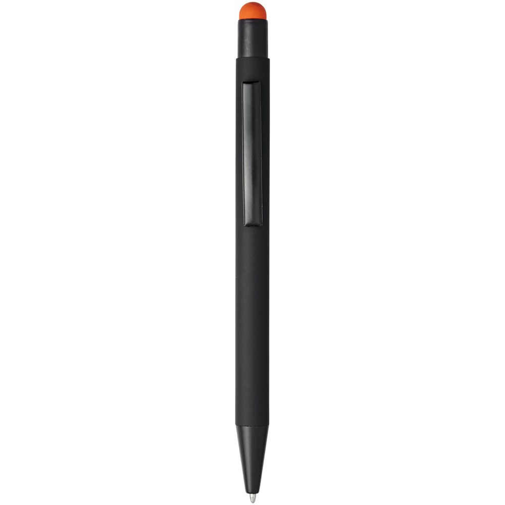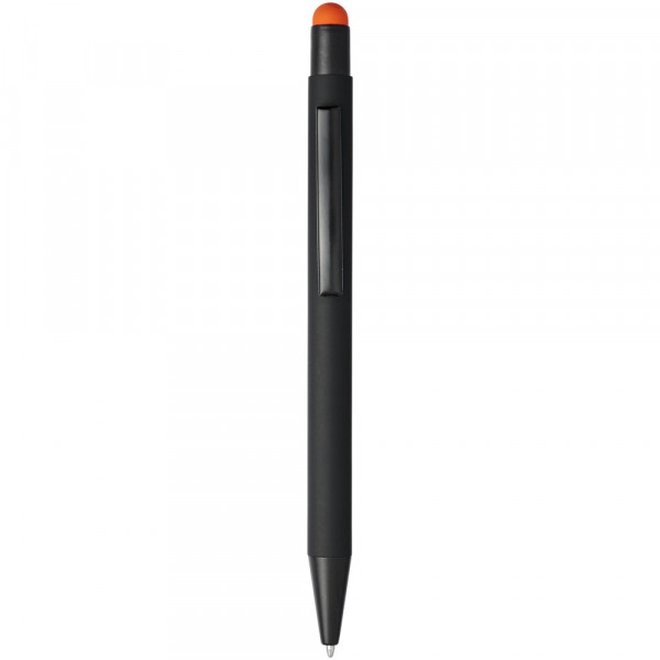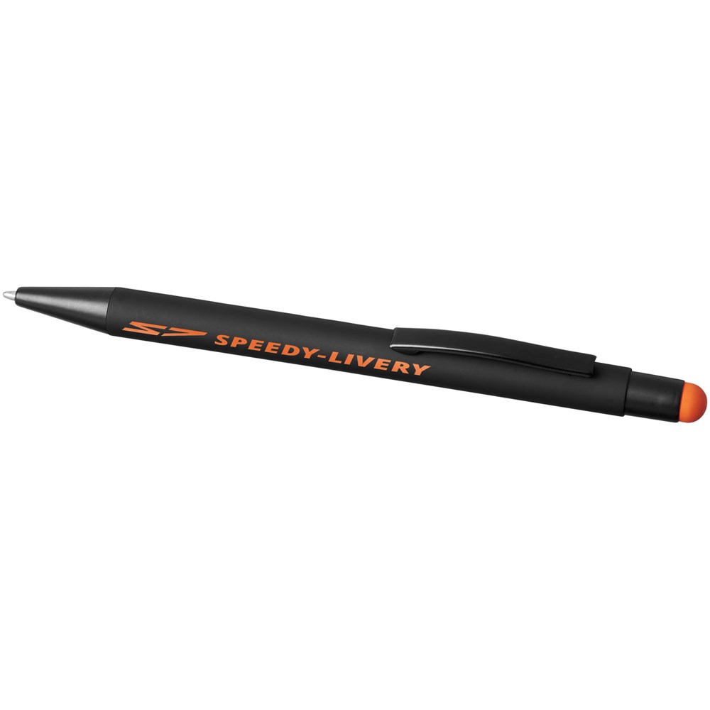 Gummierter Stylus-Kugelschreiber mit Klickmechanismus. Die Farbe der Stylusspitze entspricht der lasergravierten Unterschicht des Stiftes. Der Stift hat einen Metallclip und einen Gummi-Eingabestift und ist aus Aluminium gefertigt. Schreiblänge: 450 m.
