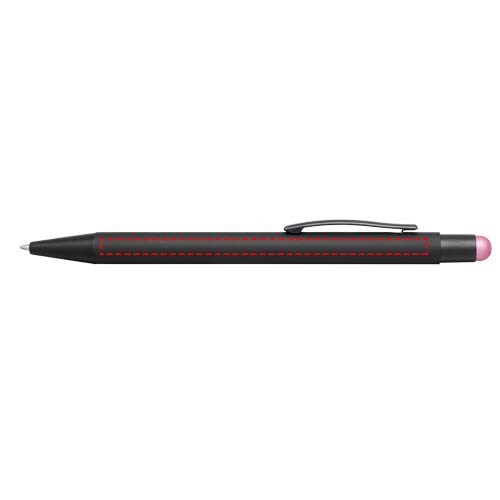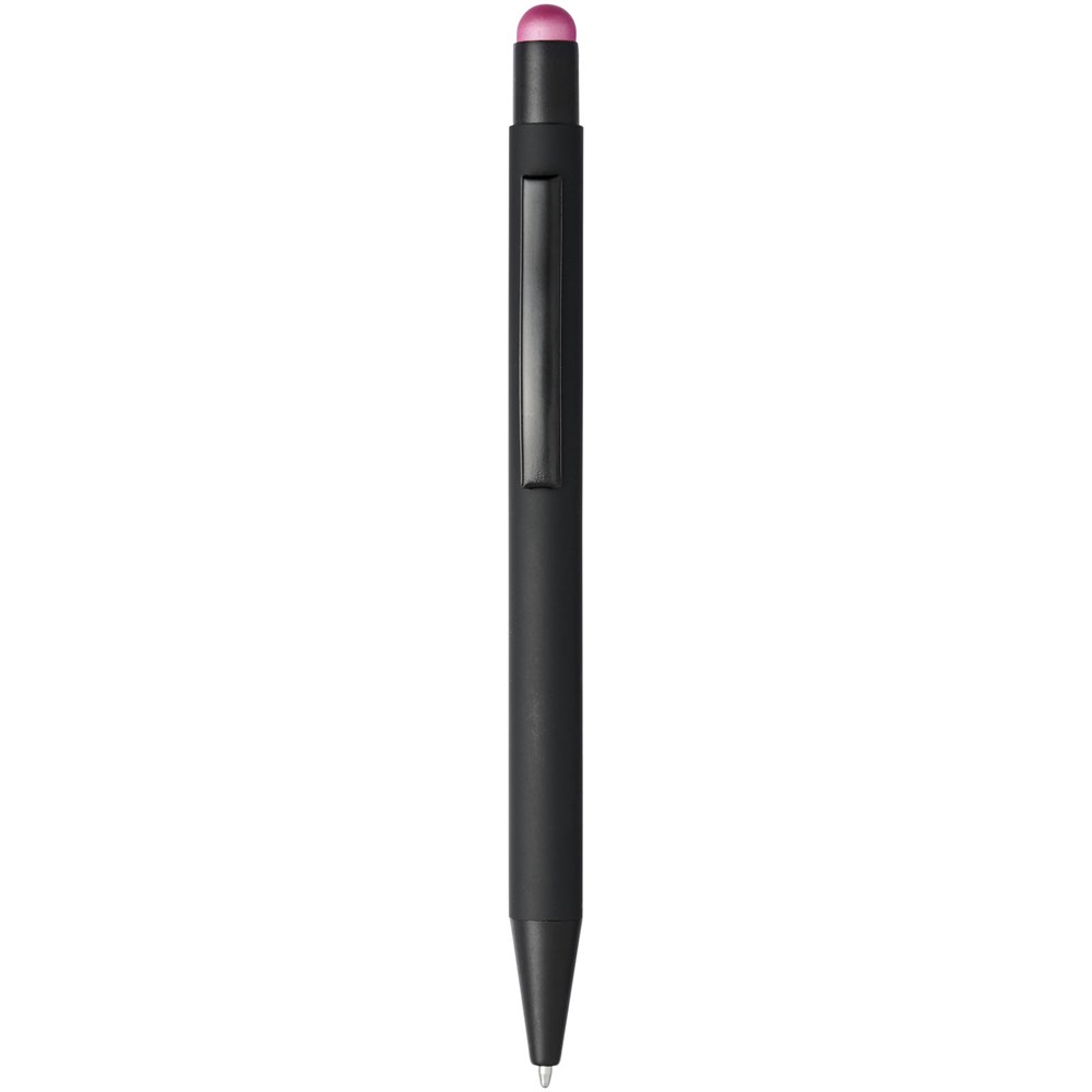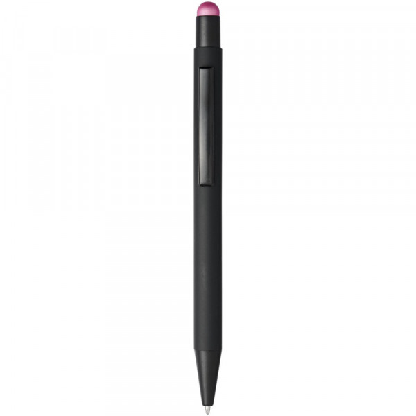 Gummierter Stylus-Kugelschreiber mit Klickmechanismus. Die Farbe der Stylusspitze entspricht der lasergravierten Unterschicht des Stiftes. Der Stift hat einen Metallclip und einen Gummi-Eingabestift und ist aus Aluminium gefertigt. Schreiblänge: 450 m.