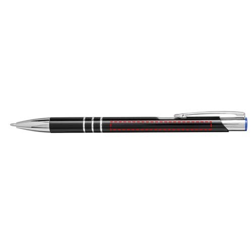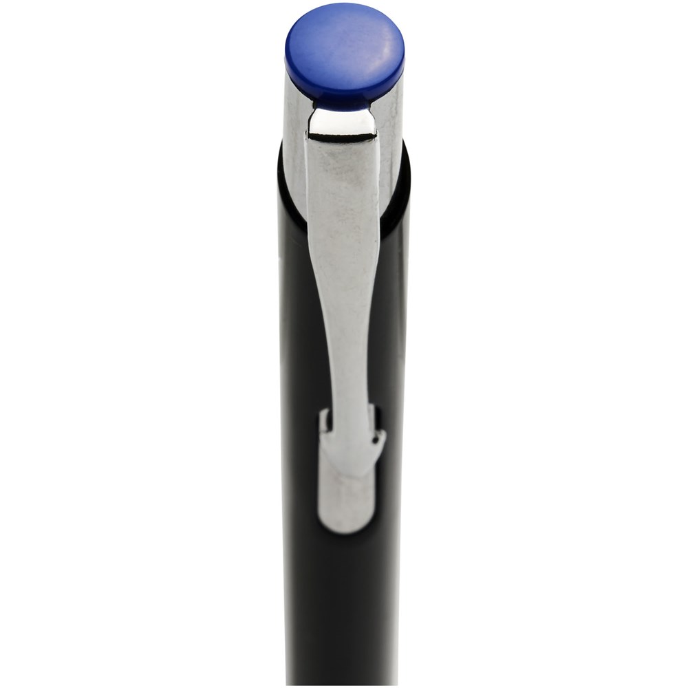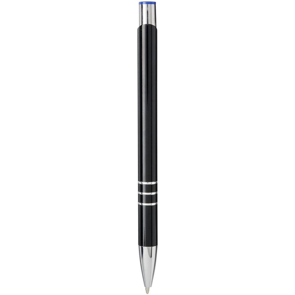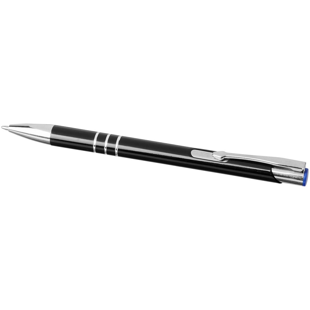 Kugelschreiber mit schwarzem Schaft und Klickmechanismus in verschiedenen Farben oben am Stift. Bei der Lasergravur ist die Farbe darunter sichtbar, passend zur Farbe oben am Stift. Der Stift hat einen Metallclip, einen Aluminiumschaft und eine ABS-Spitze und -Oberseite. Das umfangreiche und beliebte Moneta-Sortiment ist in vielen verschiedenen Stilen und Ausführungen erhältlich.