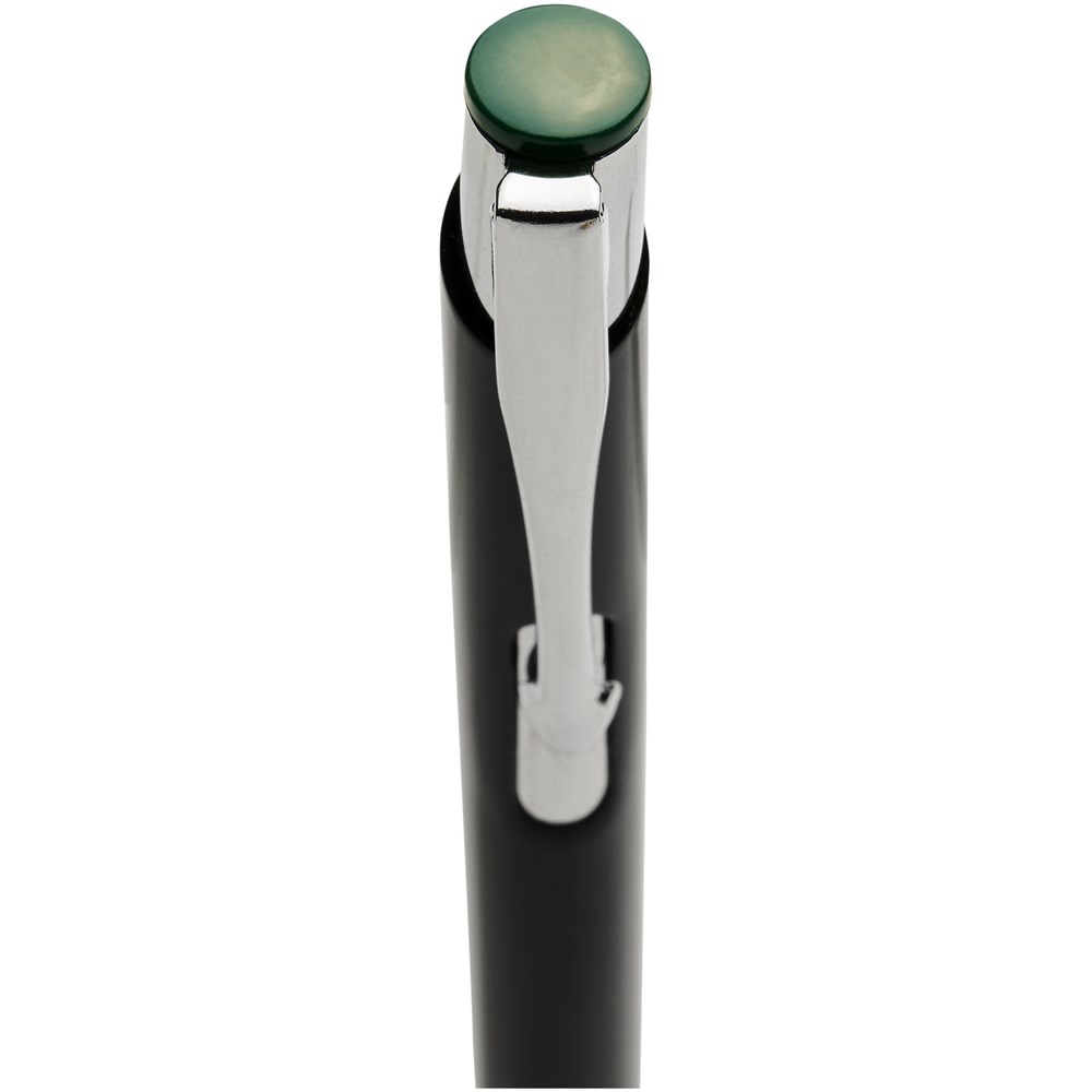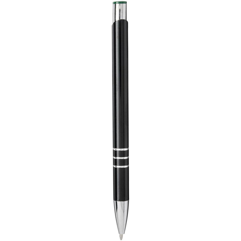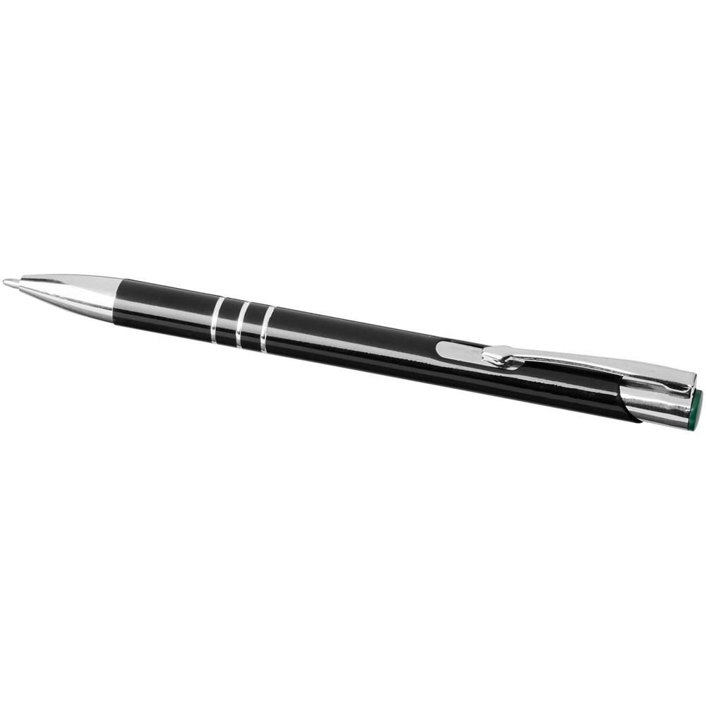 Kugelschreiber mit schwarzem Schaft und Klickmechanismus in verschiedenen Farben oben am Stift. Bei der Lasergravur ist die Farbe darunter sichtbar, passend zur Farbe oben am Stift. Der Stift hat einen Metallclip, einen Aluminiumschaft und eine ABS-Spitze und -Oberseite. Das umfangreiche und beliebte Moneta-Sortiment ist in vielen verschiedenen Stilen und Ausführungen erhältlich.