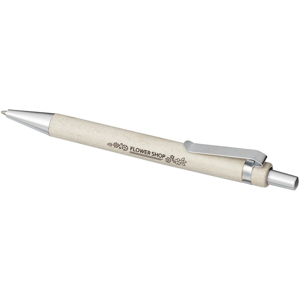 Moderner Kugelschreiber mit Klickmechanismus, mit Schaft aus Weizenstroh und markanten chromfarbenen Details. Bei Weizenstroh handelt es sich um zurückgebliebene Stiele nach der Ernte von Weizenkörnern, was die Menge an Kunststoff reduziert.