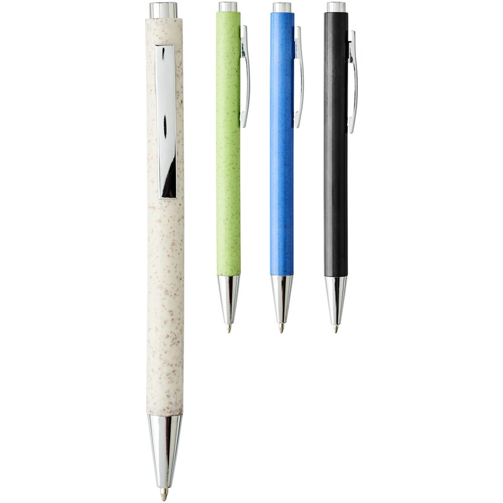 Eleganter, klassischer Kugelschreiber mit Klickmechanismus, mit Schaft aus Weizenstroh und markanten chromfarbenen Details. Bei Weizenstroh handelt es sich um zurückgebliebene Stiele nach der Ernte von Weizenkörnern, was die Menge an Kunststoff reduziert.