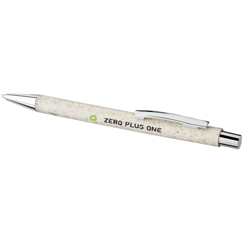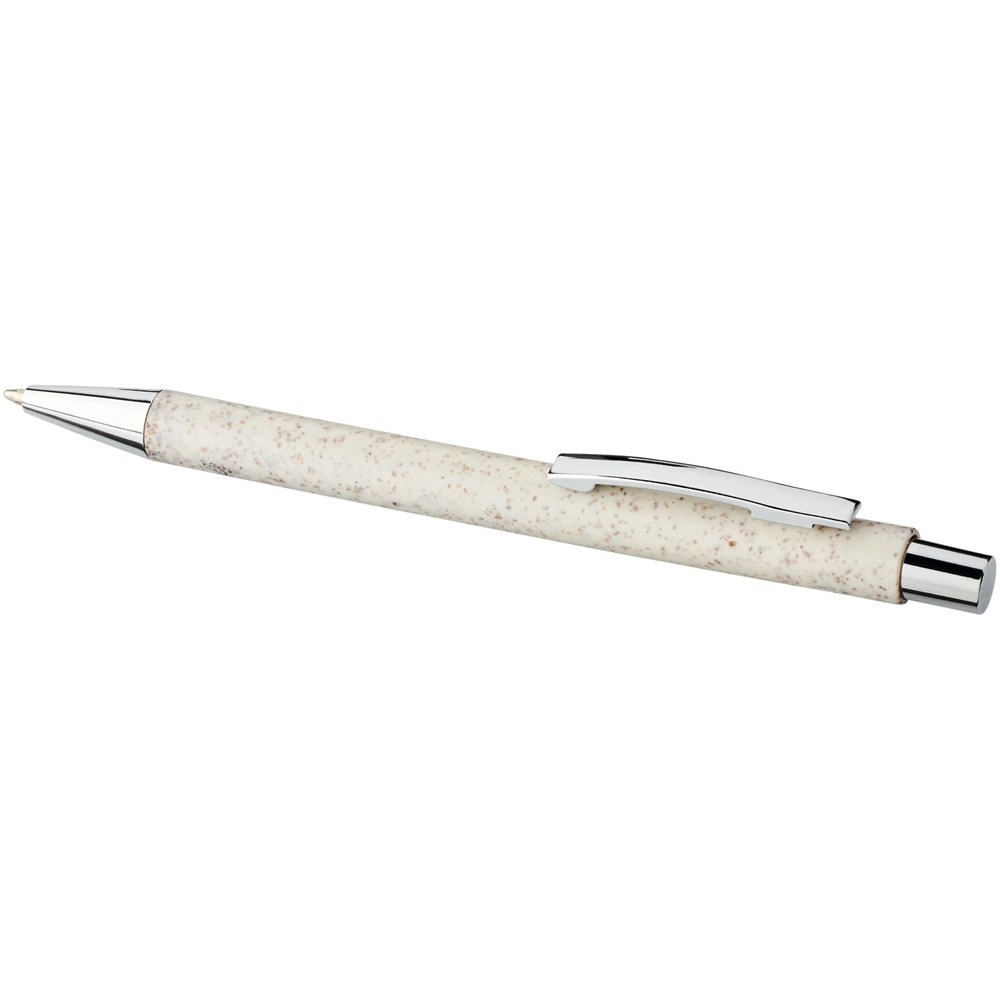 Eleganter, klassischer Kugelschreiber mit Klickmechanismus, mit Schaft aus Weizenstroh und markanten chromfarbenen Details. Bei Weizenstroh handelt es sich um zurückgebliebene Stiele nach der Ernte von Weizenkörnern, was die Menge an Kunststoff reduziert.