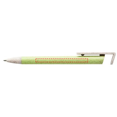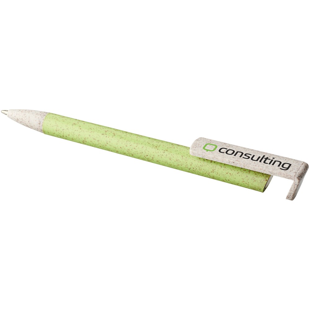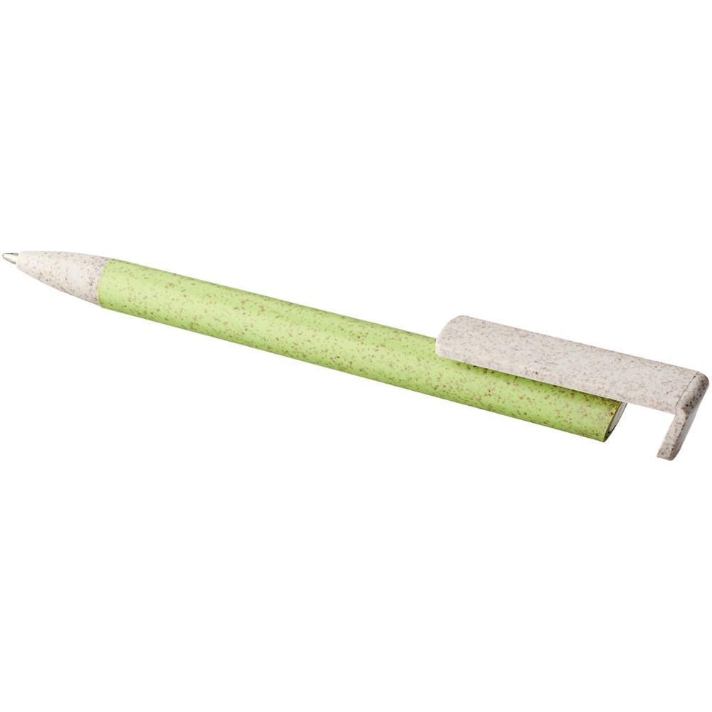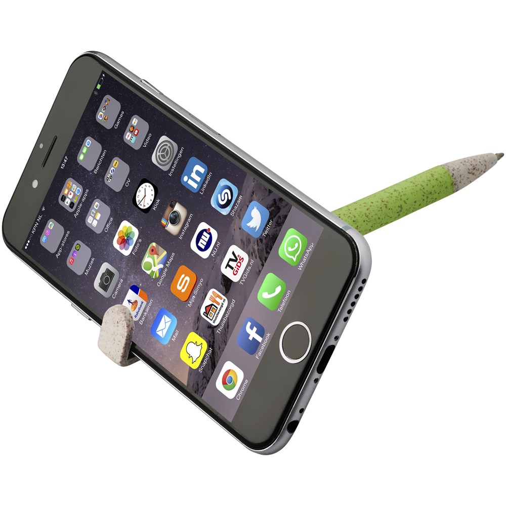 Kugelschreiber mit Klickmechanismus aus Weizenstroh. Bei Weizenstroh handelt es sich um zurückgebliebene Stiele nach der Ernte von Weizenkörnern, was die Menge an Kunststoff reduziert. Der obere Teil des Stifts dient gleichzeitig als Halterung für Smartphones zum einfachen Freisprechen.