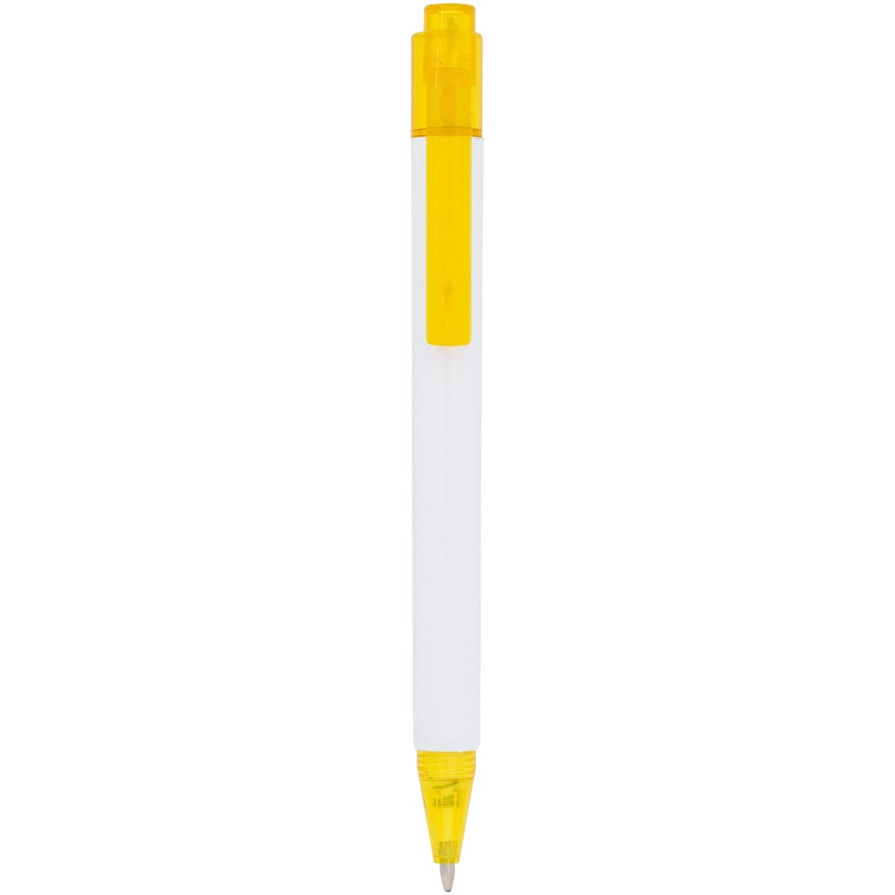 Der Calypso Kugelschreiber hat einen schlanken weißen Schaft mit durchscheinender farbiger Nase und Clip.