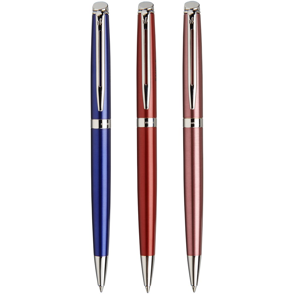Eleganter Kugelschreiber, Rollerball-Stift und Füllfederhalter in schlanker Form mit einer dynamischen Kombination von Elementen wie schlankem Clip und breitem Ring, um die charakteristisch schmale Form zu unterstreichen. Erhältlich in drei modischen Farben: Oberfläche in zeitgemäßem Metallic-Rot, Korallenrosa und Metallic-Blau. Verpackt in einem Waterman-Geschenkkarton.