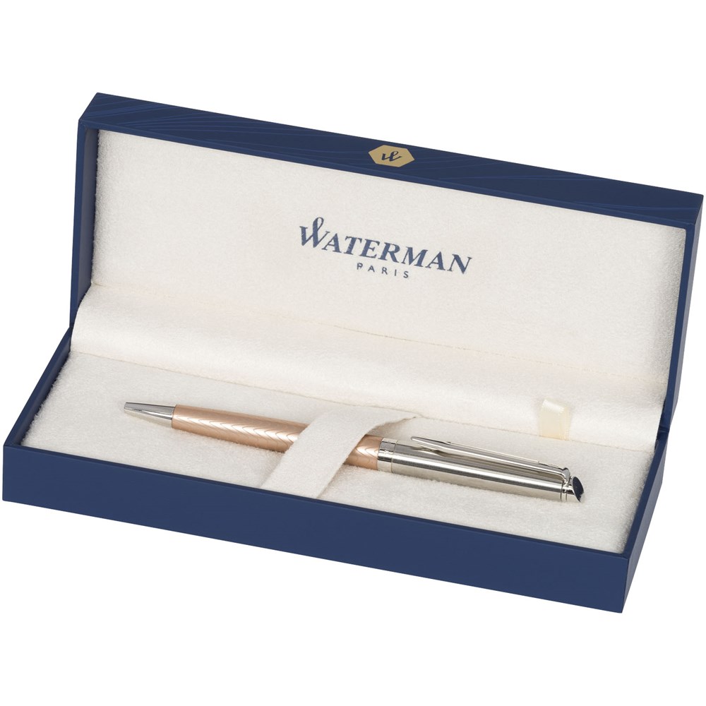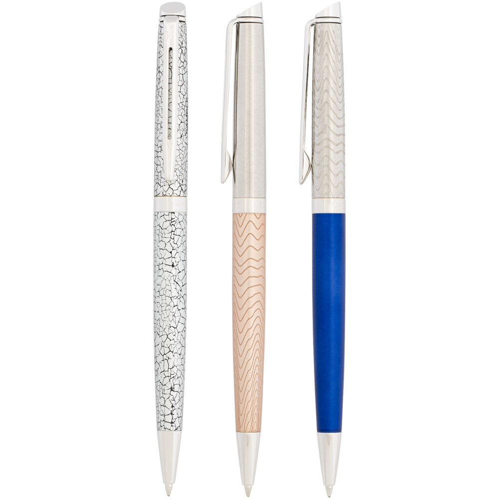 Die neue Hémisphère Premium-Kollektion mit fließenden Lasermustern, die die wunderschöne Form der Stifte respektieren und Trends wie natürliche/organische Elemente aufgreifen. Erhältlich als Kugelschreiber, Rollerball-Stift und Füllfederhalter und in 3 Farben/Designs: Eine lebhaft blaue Lackoberfläche komplett mit aufwendigem Signaturmuster eingeätzt in die Kappe, raffinierter Rose-Oberfläche mit subtil eingeätztem Muster und einem unvorhersehbarem und aufwendigem Muster mit palladium-plattierten Verzierungen. Verpackt in einem Waterman-Geschenkkarton.