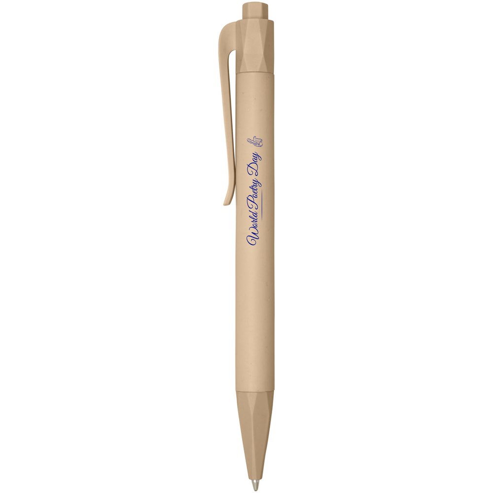 Langlebiger und nachfüllbarer Kugelschreiber mit Klick-Mechanismus aus 100 % PLA (Getreide Kunststoff), der die Menge des verwendeten Kunststoffs reduziert. Beinhaltet eine Nachfüllung mit einer Schreiblänge von ca. 2000 Metern. Der Stift wird standardmäßig mit einer blauen Tintenfüllung geliefert, die auf Anfrage auch in Schwarz geliefert werden kann. Verpackt in einer Stifthülle aus Karton.