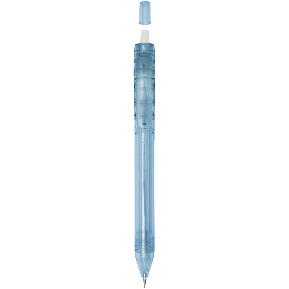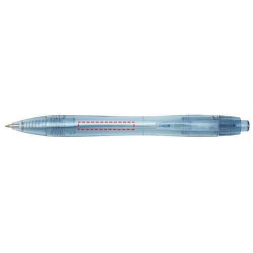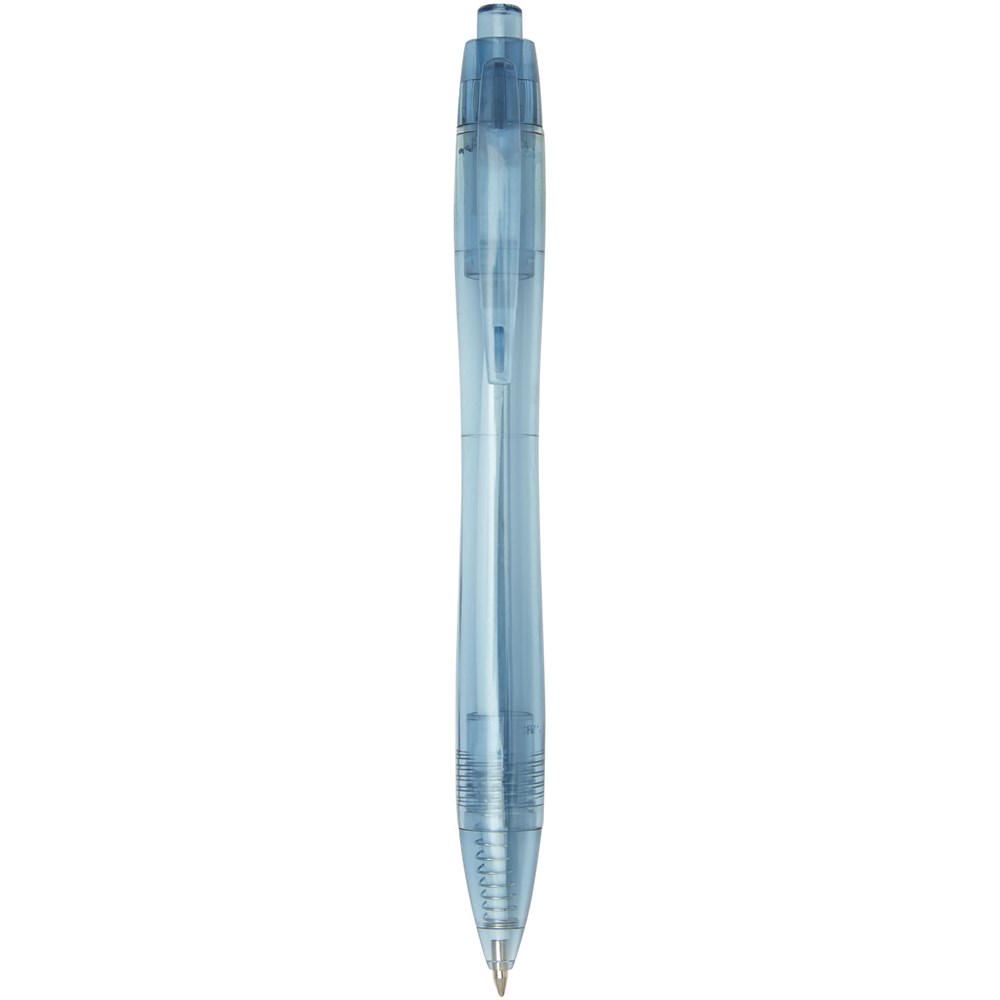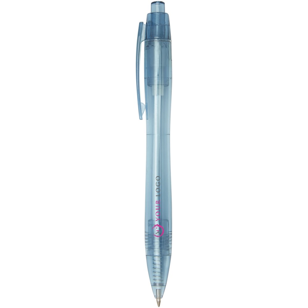Kugelschreiber mit Klickmechanismus und transparentem Schaft. Der Schaft besteht aus recycelten Wasserflaschen, was dazu beiträgt, die Menge an Kunststoffabfällen zu reduzieren.
