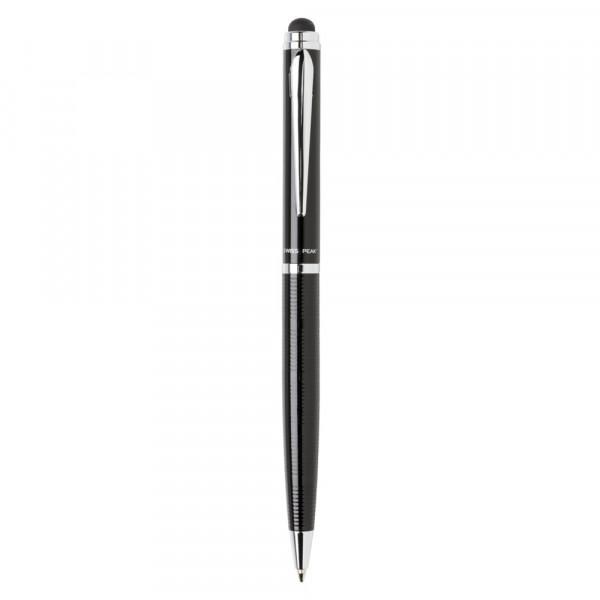 Ein besonderer Stift mit feinen Linien am Schaft. Dieser exklusive Stylus Kugelschreiber ist ein Geschenk der besonderen Art und kommt in einer Swiss Peak Röhren-Geschenkverpackung. Blau schreibend.