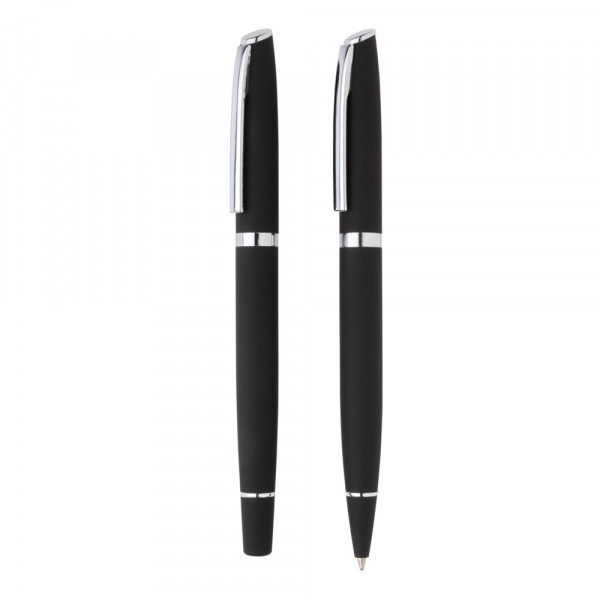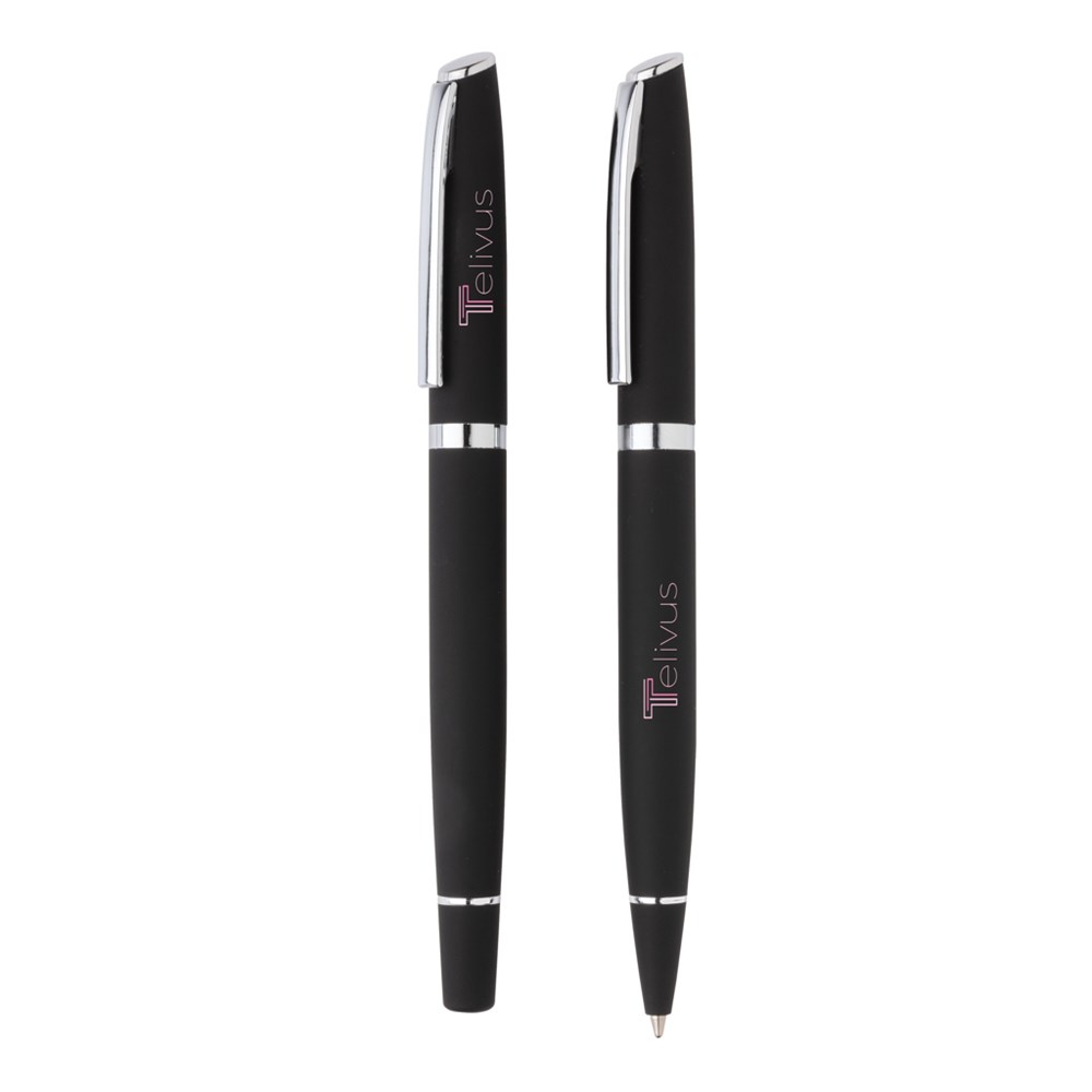 Schlicht und elegant. Das matte Finish dieses Stifte-Sets verleiht ihm ein besonders luxuriöses Erscheinungsbild und ist auch haptisch ein Highlight. Das Set, bestehend aus einem Kugelschreiber und einem Tintenroller, haben beide eine Mine mit blau schreibender Dokumental® Tinte. Der Kugelschreiber schreibt 1200m, der Tintenroller 400m. Verpackt in farblich passender Geschenkbox.