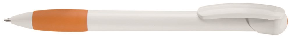 Druckkugelschreiber mit gepolsterter Softgriffzone und Clipdrückermechanik. Leicht gebogener Clip. Clipdrücker, Schaft und Spitze unifarben weiß. Stopfen und gepolsterte Softgriffzone unifarben. Ebenfalls Standard: alle Teile komplett unifarben mit silbernem Stopfen.