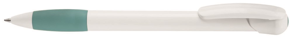 Druckkugelschreiber mit gepolsterter Softgriffzone und Clipdrückermechanik. Leicht gebogener Clip. Clipdrücker, Schaft und Spitze unifarben weiß. Stopfen und gepolsterte Softgriffzone unifarben. Ebenfalls Standard: alle Teile komplett unifarben mit silbernem Stopfen.