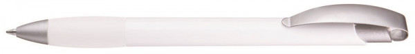 Druckkugelschreiber mit geschwungenem, matt verchromtem Metallbogenclipdrücker und gepolsterter Softgriffzone. Spitze matt silber.