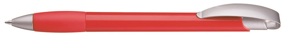 Druckkugelschreiber mit geschwungenem, matt verchromtem Metallbogenclipdrücker und gepolsterter Softgriffzone. Spitze matt silber.