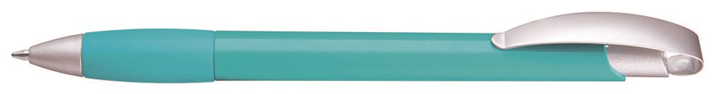 Druckkugelschreiber mit geschwungenem, matt verchromtem Metallbogenclipdrücker und gepolsterter Softgriffzone. Spitze matt silber.