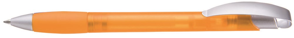 Druckkugelschreiber mit transparent gefrostetem Gehäuse, geschwungenem, matt verchromtem Metallbogenclipdrücker und gepolsterter Softgriffzone. Schaft und Griffzone unifarben transparent gefrostet. Spitze matt silber.