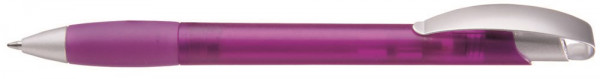 Druckkugelschreiber mit transparent gefrostetem Gehäuse, geschwungenem, matt verchromtem Metallbogenclipdrücker und gepolsterter Softgriffzone. Schaft und Griffzone unifarben transparent gefrostet. Spitze matt silber.