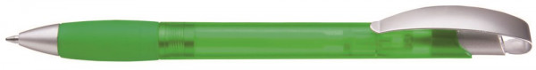 Druckkugelschreiber mit transparent gefrostetem Gehäuse, geschwungenem, matt verchromtem Metallbogenclipdrücker und gepolsterter Softgriffzone. Schaft und Griffzone unifarben transparent gefrostet. Spitze matt silber.