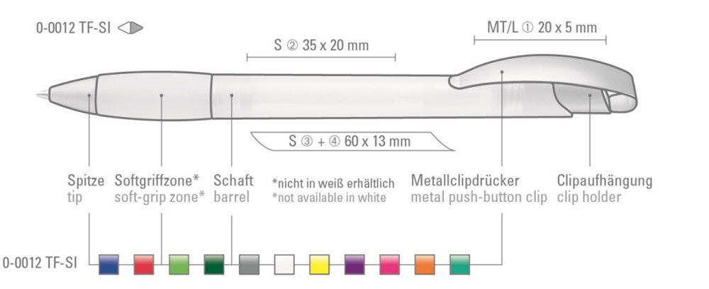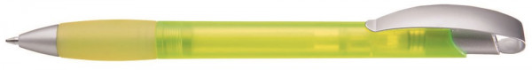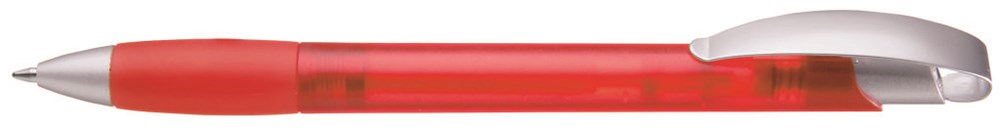Druckkugelschreiber mit transparent gefrostetem Gehäuse, geschwungenem, matt verchromtem Metallbogenclipdrücker und gepolsterter Softgriffzone. Schaft und Griffzone unifarben transparent gefrostet. Spitze matt silber. Minentype: uma Jumbo Refill Minenfarbe: blau