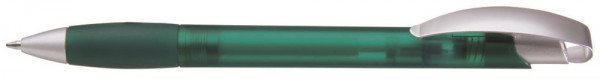 Druckkugelschreiber mit transparent gefrostetem Gehäuse, geschwungenem, matt verchromtem Metallbogenclipdrücker und gepolsterter Softgriffzone. Schaft und Griffzone unifarben transparent gefrostet. Spitze matt silber.