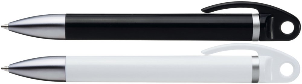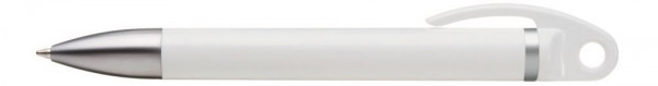 Drehkugelschreiber mit weißem oder schwarzen Gehäuse, silber mattem Zierring und schwere Mettspitze matt verchromt.