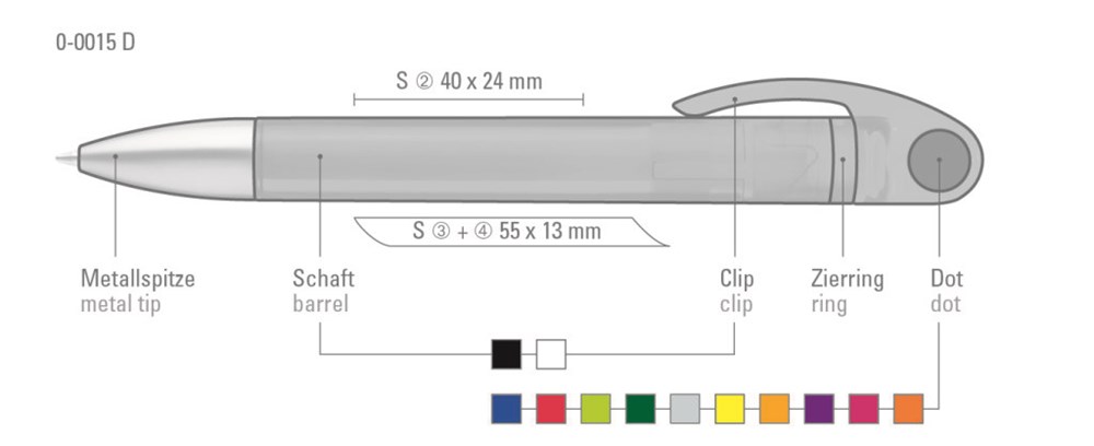 Drehkugelschreiber mit weißem oder schwarzen Gehäuse, silber mattem Zierring, farbigem Stopfen und schwere Mettspitze matt verchromt. Minentype: uma Tech Refill 1.0, schwarzes Rohr Minenfarbe: blau