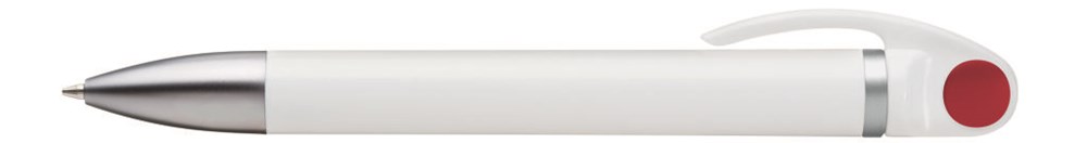 Drehkugelschreiber mit weißem oder schwarzen Gehäuse, silber mattem Zierring, farbigem Stopfen und schwere Mettspitze matt verchromt.