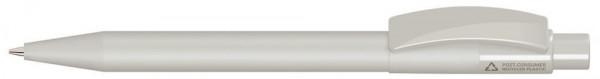 Druckkugelschreiber unifarben mit Bogenclip und matt gedecktem Gehäuse aus 100% recyceltem Post-Consumer-Kunststoff. Die Modelle sind mit Recyclingzeichen gekennzeichnet. Aufgrund der Besonderheit des Materials (Post-Consumer Recycled Plastic) sind produktionstechnische Farbschwankungen gegeben.