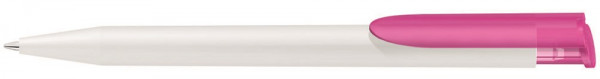 Druckkugelschreiber mit matt gedecktem Gehäuse in weiß, farbiger Clipdrücker transparent gefrostet.