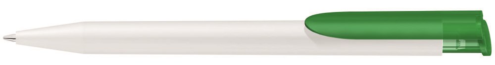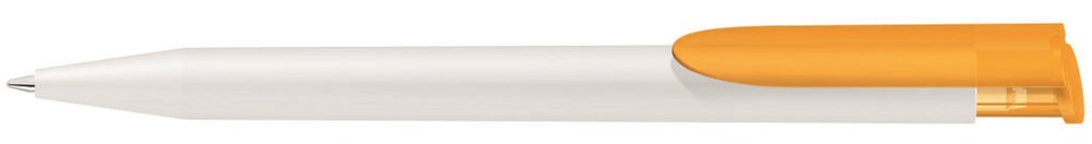 Druckkugelschreiber mit matt gedecktem Gehäuse in weiß, farbiger Clipdrücker transparent gefrostet. Minentype: uma Economy Jumbo Refill Minenfarbe: blau