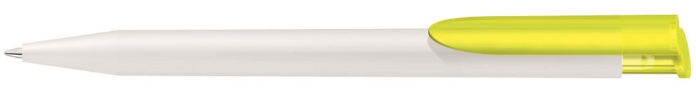 Druckkugelschreiber mit matt gedecktem Gehäuse in weiß, farbiger Clipdrücker transparent gefrostet.