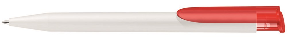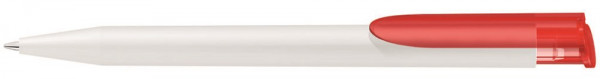 Druckkugelschreiber mit matt gedecktem Gehäuse in weiß, farbiger Clipdrücker transparent gefrostet.