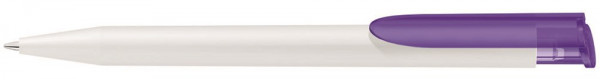 Druckkugelschreiber mit matt gedecktem Gehäuse in weiß, farbiger Clipdrücker transparent gefrostet.