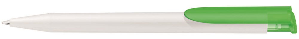 Druckkugelschreiber mit matt gedecktem Gehäuse in weiß, farbiger Clipdrücker transparent gefrostet.