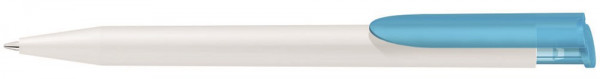 Druckkugelschreiber mit matt gedecktem Gehäuse in weiß, farbiger Clipdrücker transparent gefrostet.