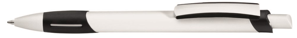 Druckkugelschreiber in weiß mit uni transparent gefrosteter Softgriffzone, Zierring und Clipschale unifarben.