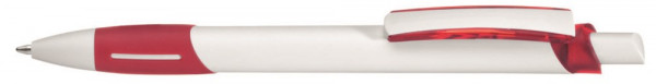 Druckkugelschreiber in weiß mit uni transparent gefrosteter Softgriffzone, Zierring und Clipschale unifarben.