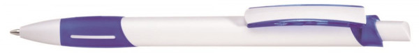 Druckkugelschreiber in weiß mit uni transparent gefrosteter Softgriffzone, Zierring und Clipschale unifarben.