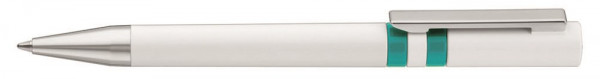 Drehkugelschreiber mit gedeckt glänzendem Gehäuse in uni weiß. Eingelassene Ringe und Stopfen im Oberteil unifarben. Metallclip und Spitze in silber glänzend.